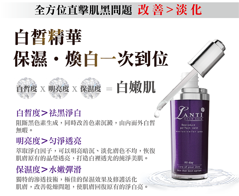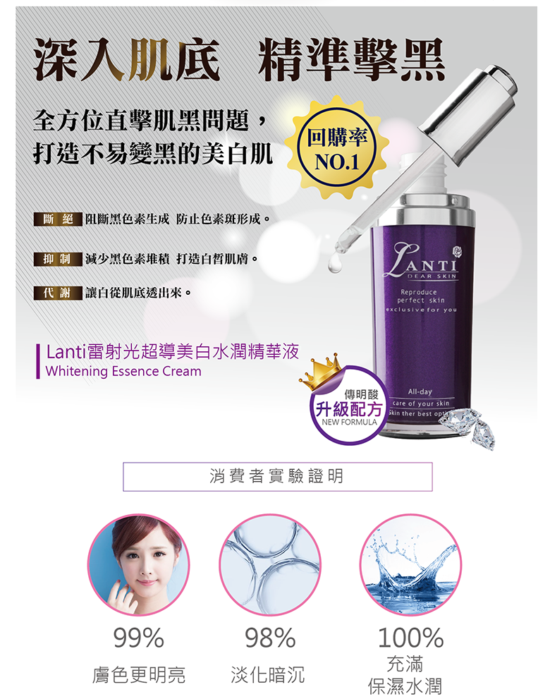 ◆商品名稱: Lanti雷射光超導美白水潤精華液
