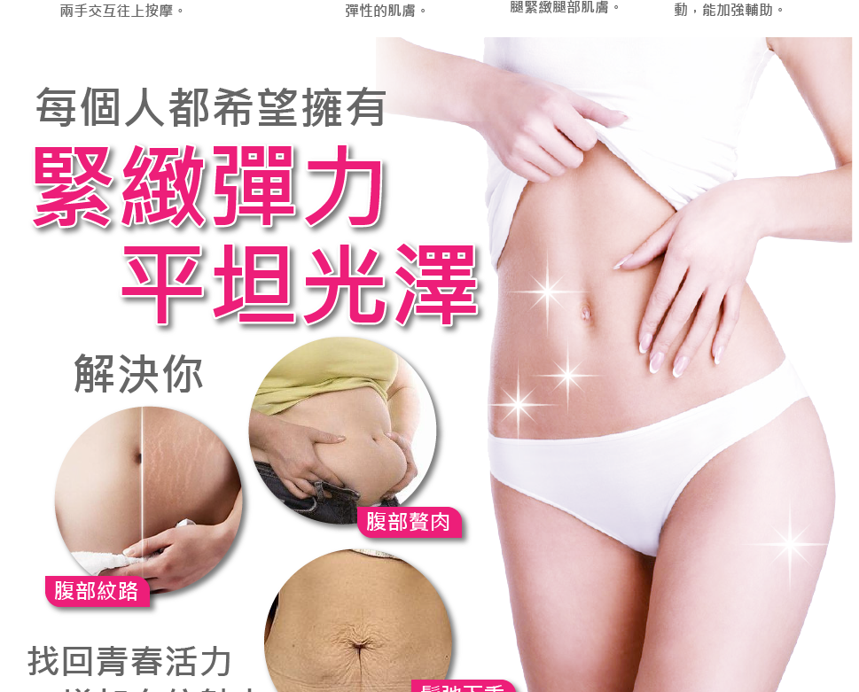 Q10緊緻纖體霜:以按摩方式均勻按摩於局部部位至少10-20分鐘以上