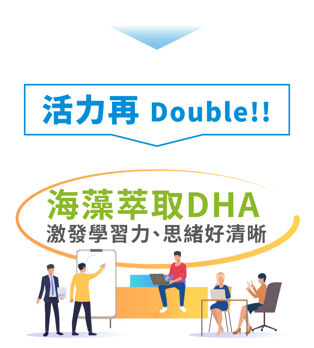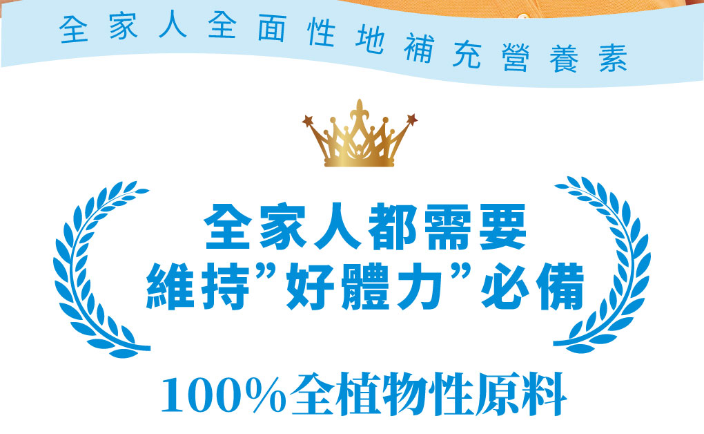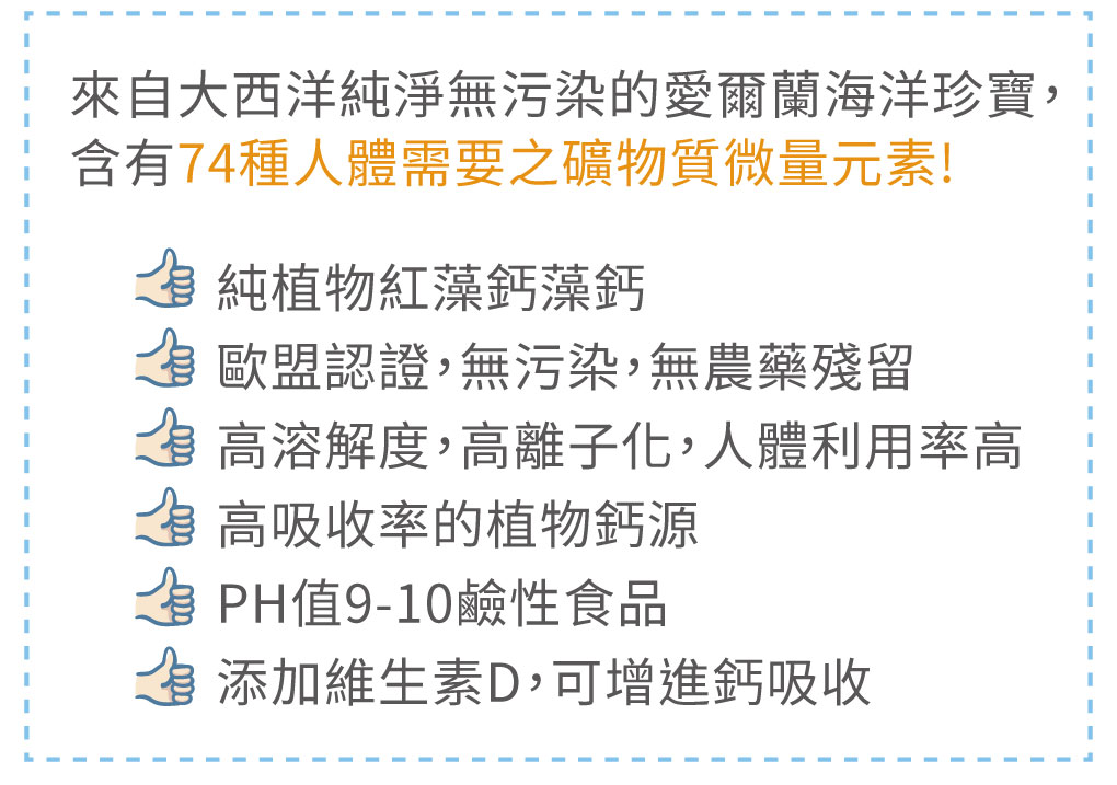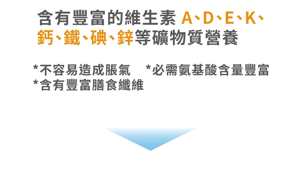 成 分:酵母發酵物、豌豆蛋白、紅藻鈣(專利)、甘胺酸亞鐵(專利)、藻類萃取(含DHA)