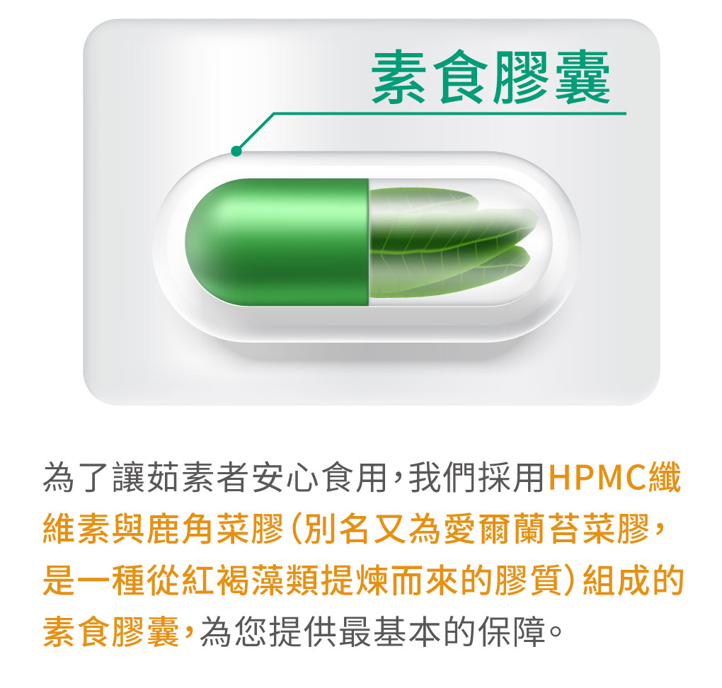 ✔領先採用素食膠囊,素食者也可安心使用